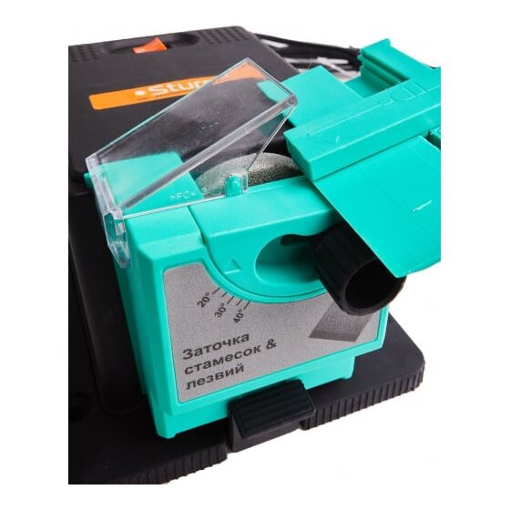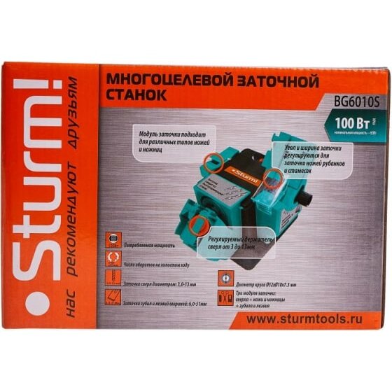 Многофункциональный точильный станок Sturm BG6010S применяется в небольших мастерских для заточки различного режущего инструмента (сверел диаметром 2-10 мм, лезвий рубанков шириной 6-51 мм, ножей, ножниц). Выполнение работ обеспечивает шлифовальный круг диаметром 49.3 мм. Защитный экран из прозрачного пластика дает возможность оператору визуально наблюдать выполнение операции. Станок имеет малые габаритные размеры и вес, что позволяет с легкостью переносить установку.