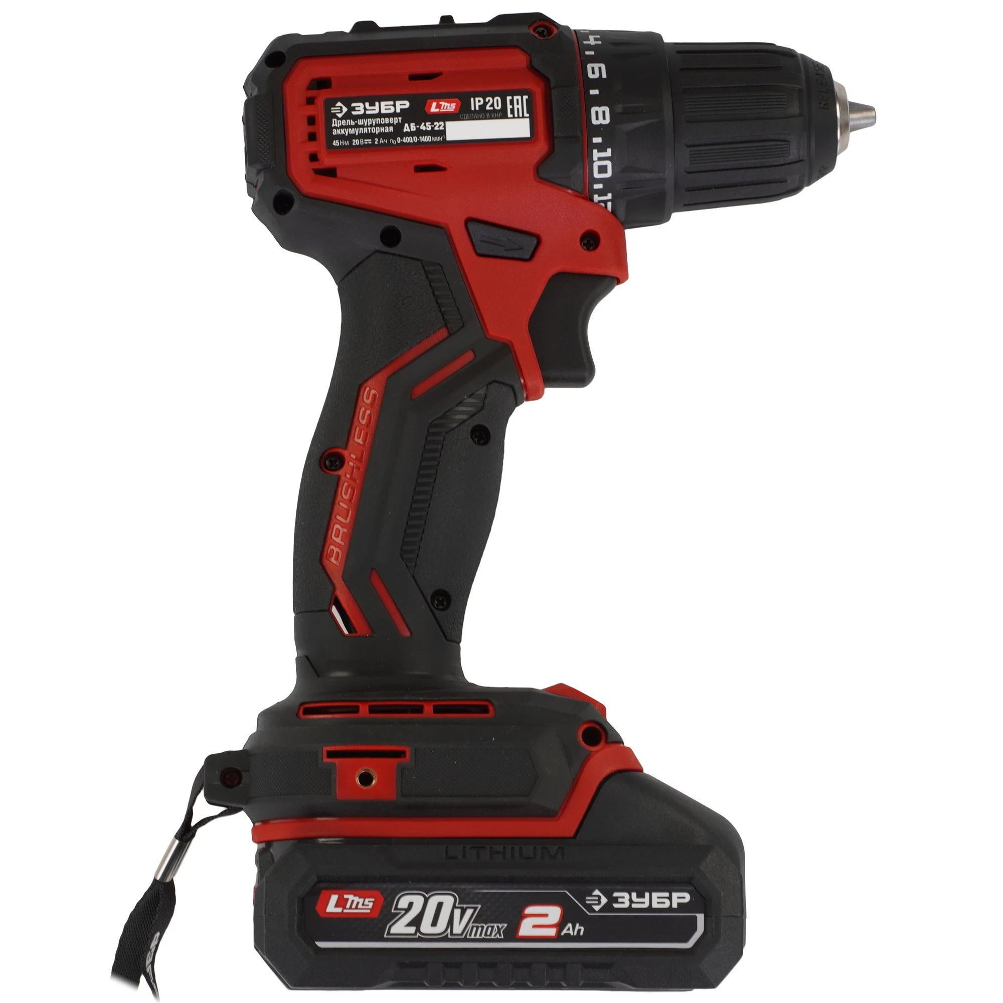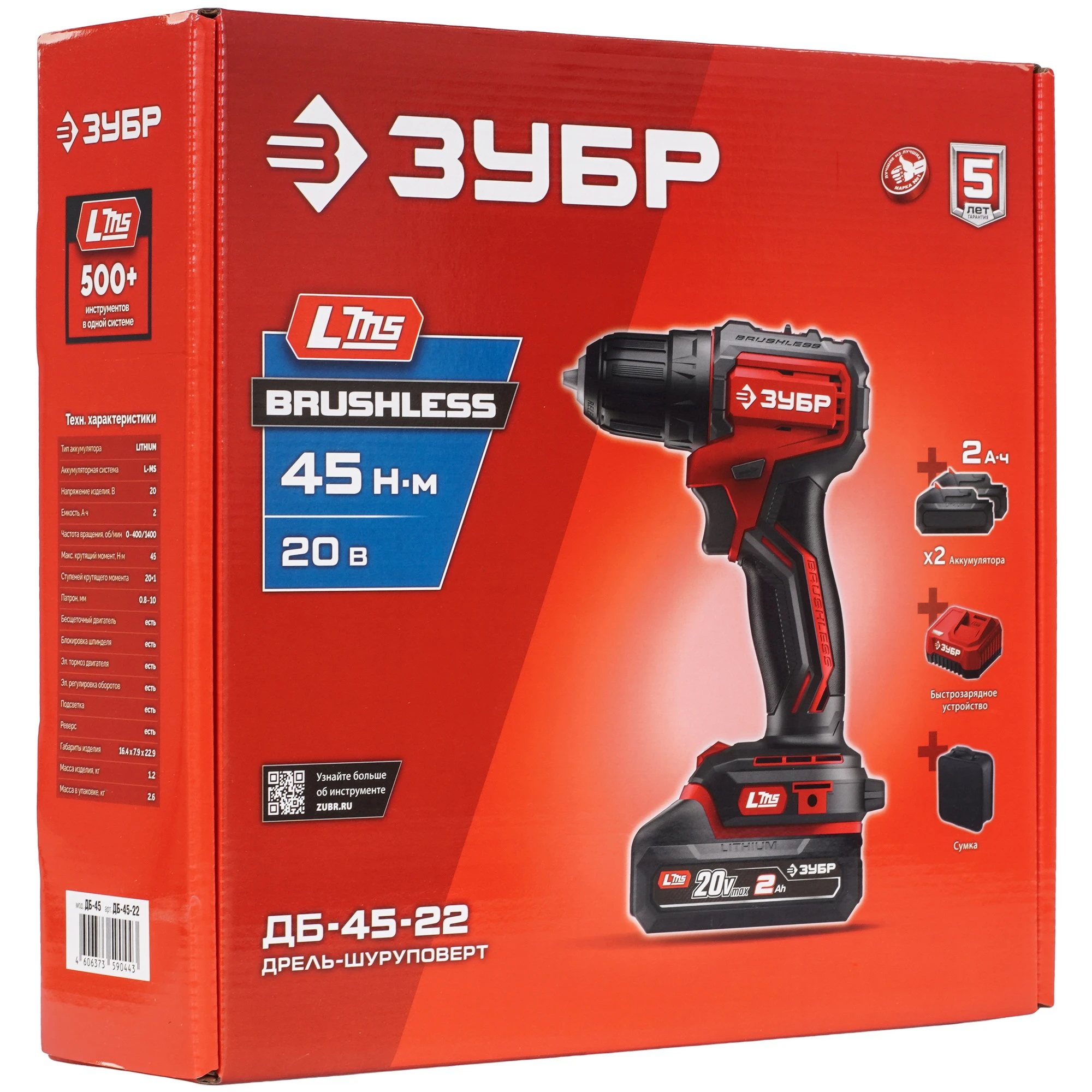 ЗУБР 20 В, 45 Н·м, 2 АКБ LMS (2 А·ч), бесщеточная дрель-шуруповерт, сумка ДБ-45-22 - инструмент из единой аккумуляторной системы LMS для 500+ инструментов.