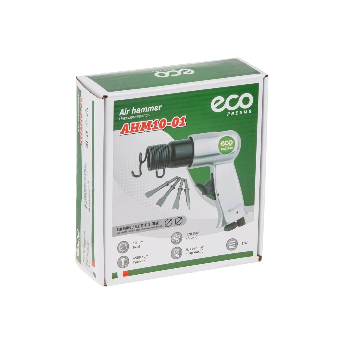 Технические характеристики ECO AHM10-01Тип инструментазубилоТип хвостовикашестигранныйРазмер шестигранника10 ммУстройство шестигранникас юбкойТип соединениярапид (EURO)Диаметр воздушного штуцера1/4F дюймРасход воздуха120 л/минДавление6.22 атмЧастота ударов4500 уд/минСила удара1.12 ДжКласс товараполупрофессиональныйГабариты без упаковки170x145x40 ммВес нетто1.12 кг
