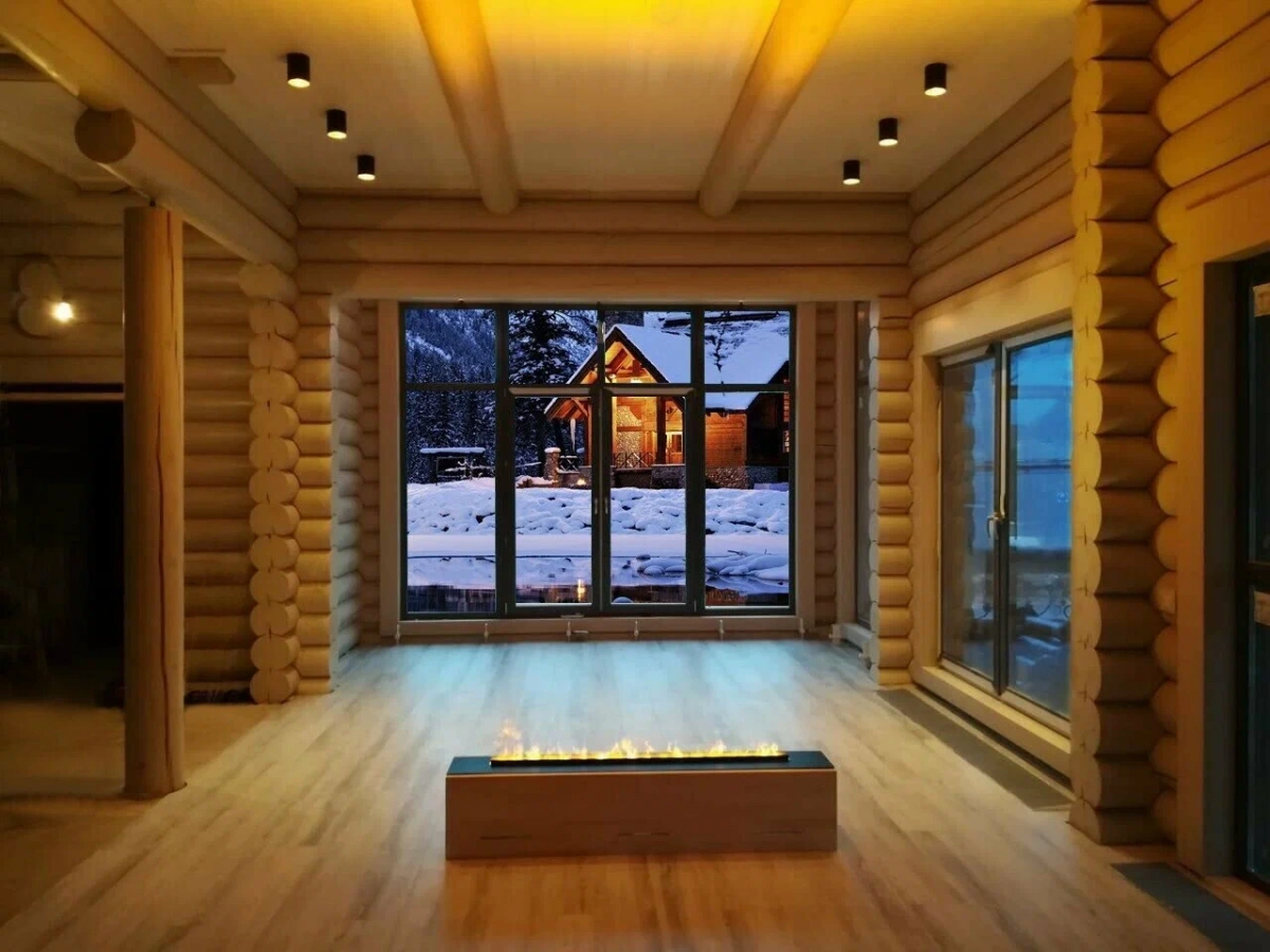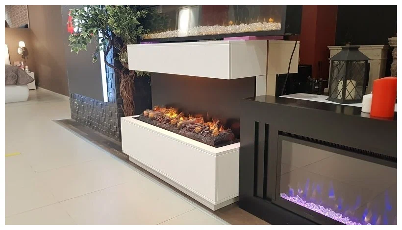Сверхширокий линейный очаг с технологией пламени 3D. Эффект пламени достигается с помощью парогенератора и галогеновых ламп, что обеспечивает ощущение огня, не отличимого от настоящего.