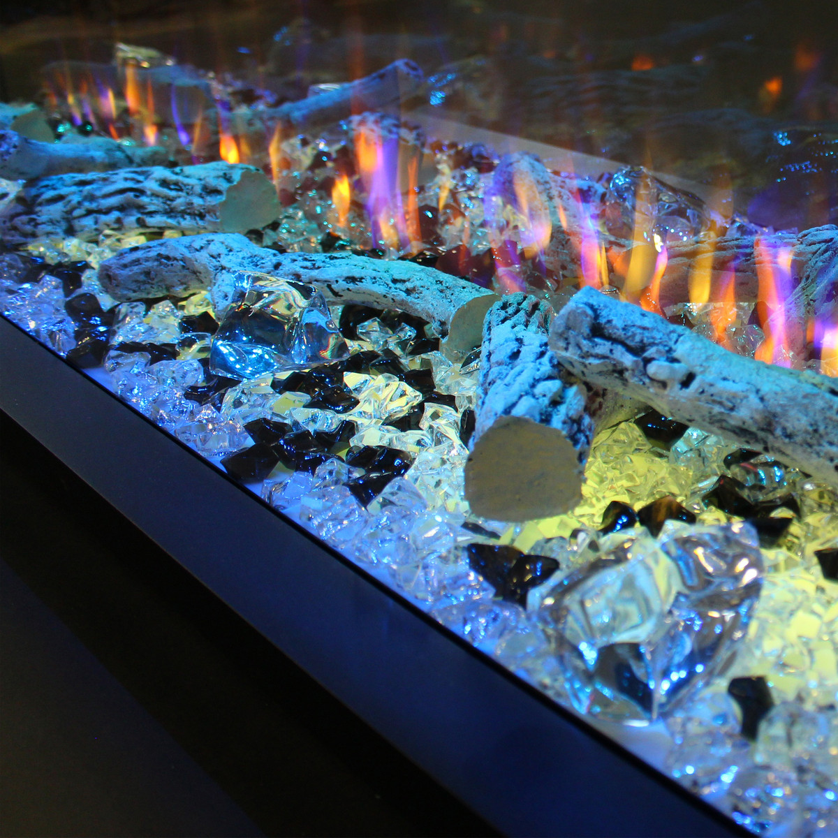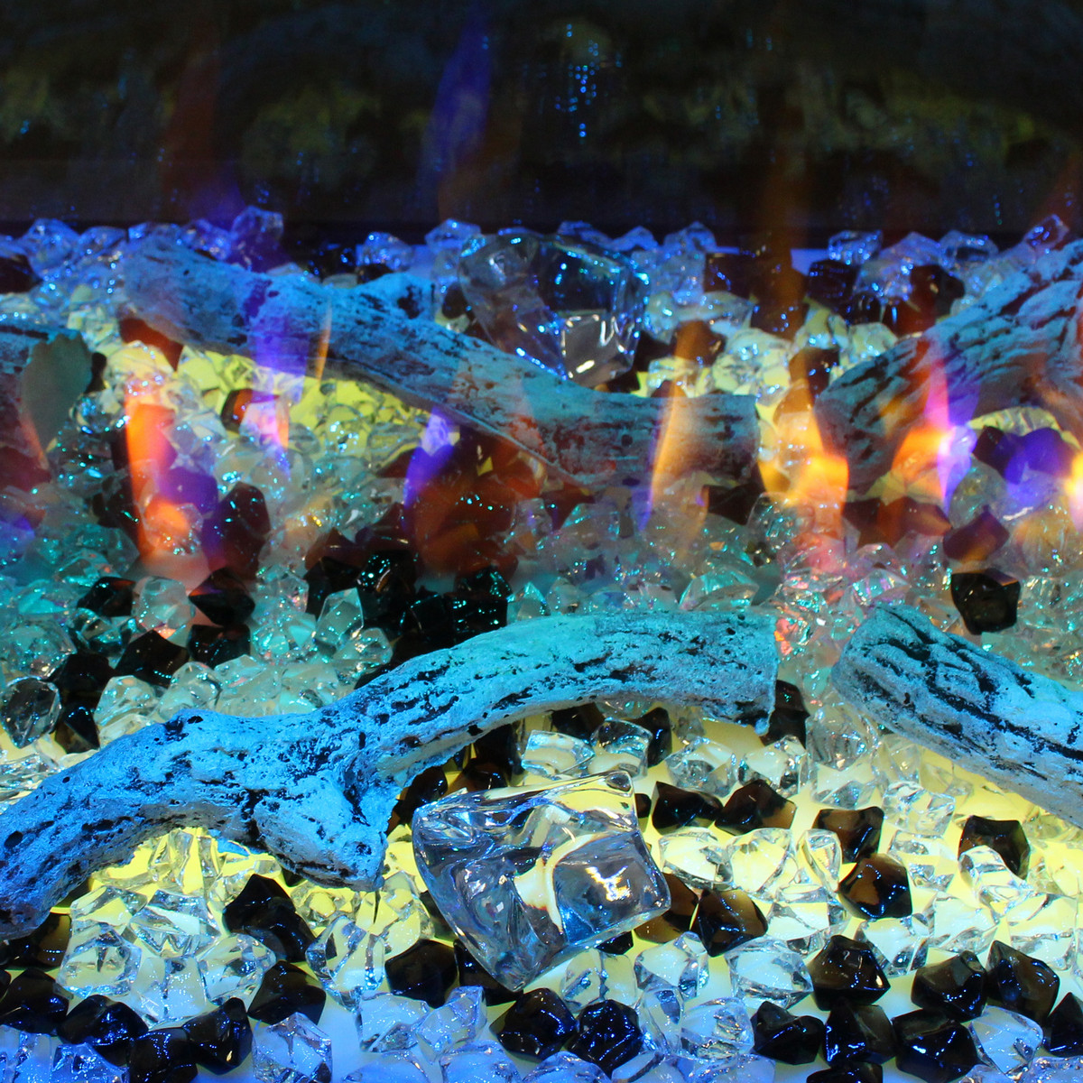 br />Для украшения электрокамина используюся: муляж дров белого цвета, небольшие кристаллы (прозрачные, черные) и крупные кристаллы.