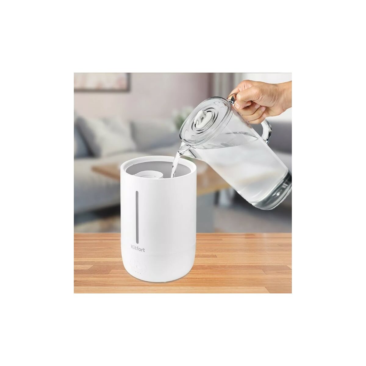 В основании увлажнителя Kitfort КТ-2832 встроен пьезокерамический излучатель, который с помощью ультразвуковых колебаний выбивает мелкие капли воды, создавая водяной туман.