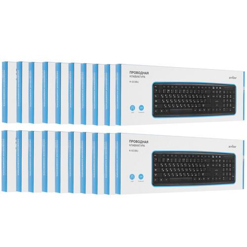 Клавиатура проводная Aceline K-503BU подключается к ноутбукам и стационарным компьютерам с использованием интерфейса USB Type-A и кабеля длиной 1.3 м. Устройство получает питание от USB и не нуждается в дополнительных источниках энергии. Клавиатура поставляется в комплекте из 20 штук.