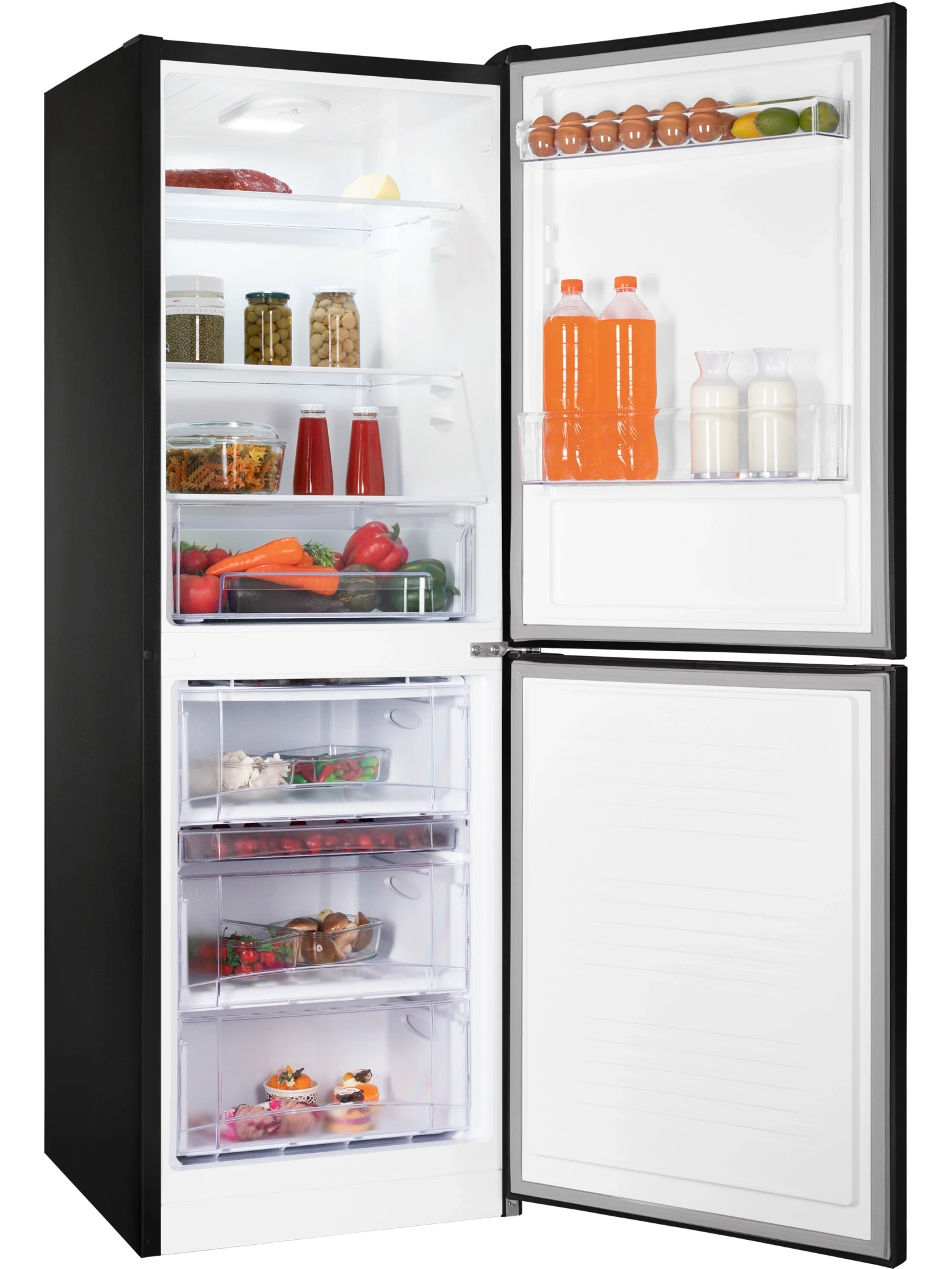 Nordfrost NRB 151 B имеет нижнее расположение морозильной камеры. Это обеспечивает удобный доступ к часто используемым продуктам. В морозильной камере предусмотрено 4 ящика для удобной организации хранения. В холодильной камере – 3 полки и 1 ящик для овощей и фруктов, а также 2 полки на дверце.