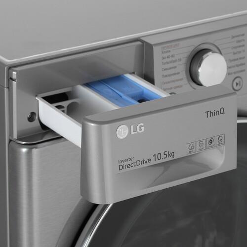 Панель управления с кнопками и дисплеем гарантирует простой выбор необходимых параметров. Модуль Wi-Fi позволяет организовать удаленное управление через фирменное приложение LG ThinQ на смартфоне. Система автовзвешивания автоматически определяет требуемое количество воды. Из особенностей LG TW4V5RS2S отмечаются защита от скачков напряжения, блокировка панели управления и регулируемые ножки.