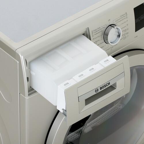 Сушильная машина Bosch WTN86202ME в корпусе серого цвета оборудована самоочищающимся конденсатором, загрязнения из которого удаляются во время сушки. Конструкция включает фильтр, который задерживает ворс, шерсть, волосы. За 1 раз модель справляется с сушкой до 8 кг одежды. При подключении к сети используется 1.45-метровый кабель.