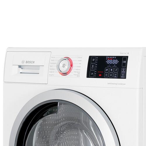 Сушильная машина Bosch WTU876BHSN с загрузкой на 9 кг имеет сенсорную панель и поворотный переключатель для доступа к 14 программам.