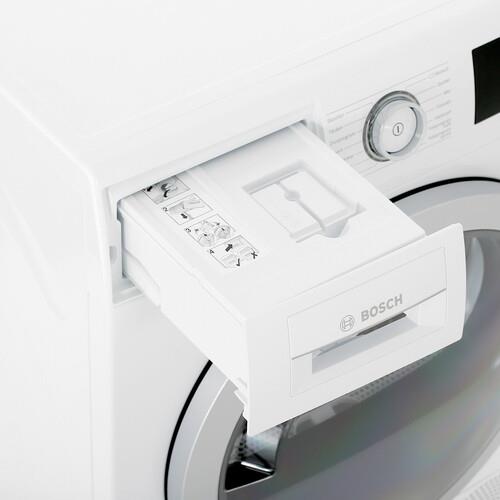 Bosch WTU876BHSN оборудована системой антисминания, не допускающей появления складок. Индикаторы информируют о наличии неисправностей и необходимости очистить бак от конденсата. Фильтр задерживает волосы, пыль, ворс. Опция бережной сушки предназначена для вещей из шерсти и шелка.