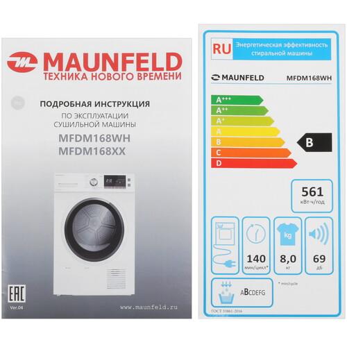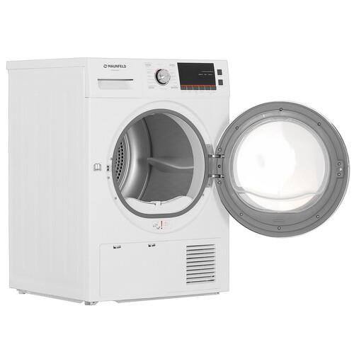 Сушильная машина MAUNFELD MFDM168WH обладает широким набором режимов и функций. Это обеспечивает быстрый и эффективный результат сушки. Аппарат выполнен в белом корпусе размерами 59.5x84.5x61.5 см, использует конденсационную сушку, в основе которой лежит тепловой насос. Он нагревает воздух внутри барабана, что обеспечивает конденсацию пара и его слив в виде воды в отверстие канализации. Такой способ сушки не предусматривает подключение машины к вентиляции, что упрощает эксплуатацию модели.