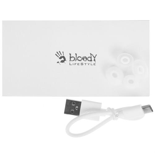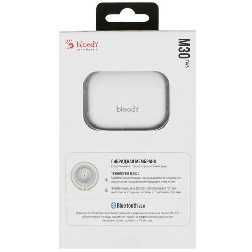 Наушники TWS A4Tech Bloody M30 подключаются к устройствам при помощи Bluetooth 5.0, среди преимуществ которого можно отметить низкое потребление энергии, а также большой радиус действия – вплоть до 10 метров. Питание модели осуществляется от встроенного аккумулятора, который способен обеспечить до 4 часов воспроизведения. Благодаря кейсу время работы может быть увеличено до 18 ч. Его зарядка осуществляется при помощи кабеля USB-C, который входит в комплект поставки.