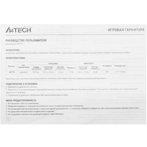 Гарнитура A4Tech Bloody MC750 подключается к компьютеру при помощи кабеля длиной 2.3 м с интерфейсом USB. Подвесное составное оголовье с системой поддержки «Парящее крыло» и амбушюры с эффектом памяти гарантируют эргономичность. Подсветка RGB на чашах создает особую атмосферу для погружения в игру. Пульт управления на проводе позволяет регулировать громкость, управлять микрофоном и подсветкой. Оплетка из ПВХ защищает кабель от заломов и повреждений.