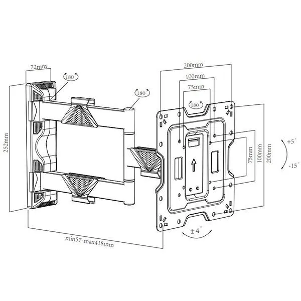 Настенный поворотно-наклонный кронштейн для телевизоров и мониторов с диагональю от 17 до 43 дюймов.Кронштейн Aspect Line-28 позволяет вращать телевизор в любых направлениях, а также вешать телевизор на угол.Двухколенная конструкция позволяет плавно менять расстояние и положение экрана относительно стены.Шарнирное соединение с подвижным коленом дает возможность поворота экрана до 90 градусов влево-вправо (угол поворота зависит только от диагонали телевизора), а также позволяет регулировать расстояние от телевизора до стены от 53 до 400 мм.Даже учитывая широкие возможности движения, кронштейн крайне компактен в сложенном состоянии, благодаря продуманному механизму складывания; Система организации проводов – Кабель-канал позволяет зафиксировать провода для удобства и эстетической красоты; Возможность гибкой регулировки – Три надёжных осевых соединения обеспечивают возможность манёвренного поворота на угол до 180° и вылета от стены от 53 до 400 мм; Лёгкая регулировка наклона – Надёжная конструкция без особых усилий позволит осуществить наклон даже тяжёлого телевизора лёгким движением на угол до +10°.РегулировкаМин. расстояние от стены, мм53Макс. расстояние от стены, мм400Макс. угол поворота (swivel)180°Макс. угол наклона вверх12°Макс. угол наклона вниз12°Макс. угол вращения (pivot)3°СовместимостьСтандарт крепления VESA100x100 мм, 200x100 мм, 200x200 ммОсновныеМин. диагональ экрана, дюймы17Макс. диагональ экрана, дюймы43Максимальная нагрузка, кг40Регулировка крепленияВыдвижение, Наклон, ПоворотМесто крепленияНа стенуОсобенностиКабель-канал