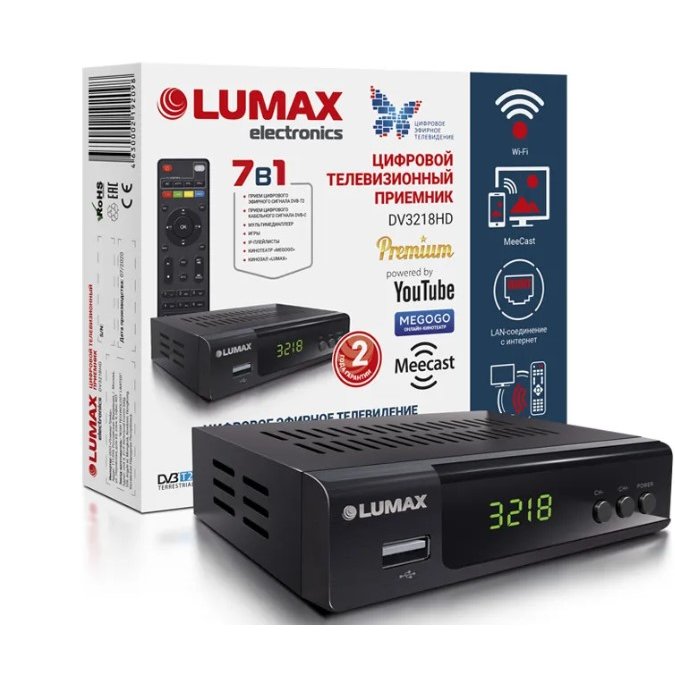 Новейшая модель цифрового телевизионного приемника LUMAX DV3218HD для приема цифрового эфирного и кабельного телевидения в стандартах DVB-T2/С с возможностью выхода в интернет порадует всех, кто любит телевидение. Благодаря сверхчувствительному улучшенному процессору* вам станут доступны первоклассное изображение и объемное стереозвучание Dolby Digital («звук вокруг»). Приемник воспроизводит все основные форматы (AVI/MKV/MPG/TS/MP3/JPG/BMP/JPEG/PNG и т. д.), есть функции родительского контроля, музыки, фото и видео, записи онлайн с экрана, TimeShift (включение паузы с возможностью последующего просмотра) и многое другое. С помощью порта LAN можно легко подключить приемник к Интернету и смотреть IP-плейлисты m3u (до 1000), YouTube, передавать контент со смартфона на телевизор с помощью MeeCast, пользоваться Gmail, а также приложениями «Кинозал LUMAX» и «Онлайн-кинотеатр Megogo», насчитывающими в своих кинотеках более 2500 любимых художественных фильмов, сказок, сериалов и т.п. Защита от короткого замыкания станет выгодным отличием LUMAX DV3218HD от приемников других производителей. В комплект входит обучаемый пульт ДУ премиум-класса.