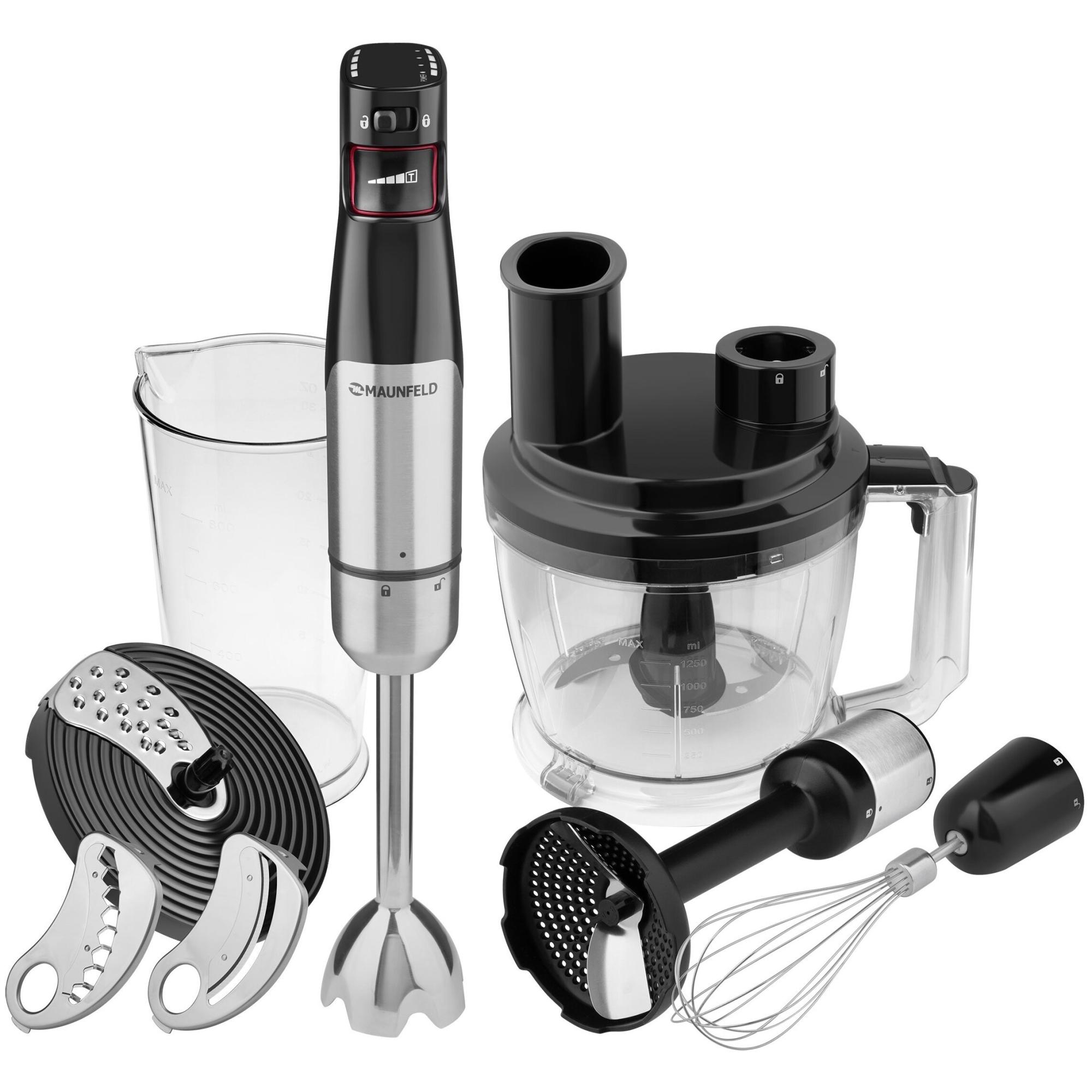 в комплекте блок двигателя, насадка для измельчения, насадка для картофельного пюре, венчик, стакан блендера с мерной шкалой, чаша измельчителя, нож для мелкой шинковки, нож для средней шинковки, нож для крупной шинковки