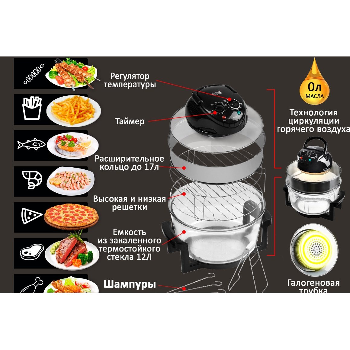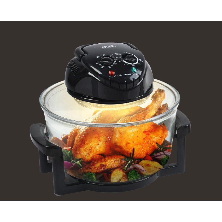 Галогенный нагревательный элемент и мощный вентилятор обеспечивают циркуляцию воздуха по всему объему чаши.