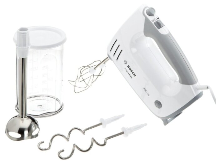 ручной миксер, мощность 450 Вт, крючки для замешивания теста, венчик для взбивания, насадка-блендер, кнопка отсоединения насадок