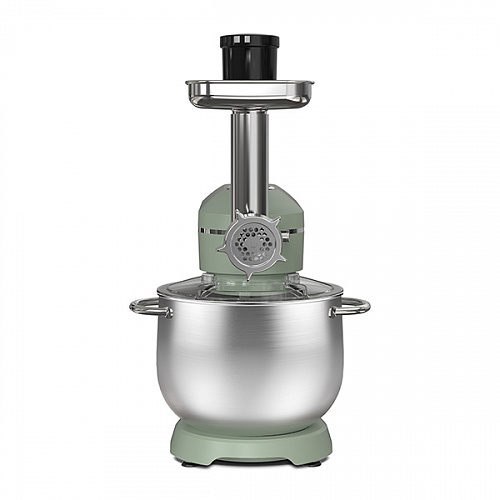 Планетарный миксер, чаша, крышка чаши, металлический венчик для взбивания, крюк для замешивания теста, насадка для смешивания, мясорубка, 3 диска для приготовления фарша, толкатель мясорубки, руководство по эксплуатации, гарантийный талон