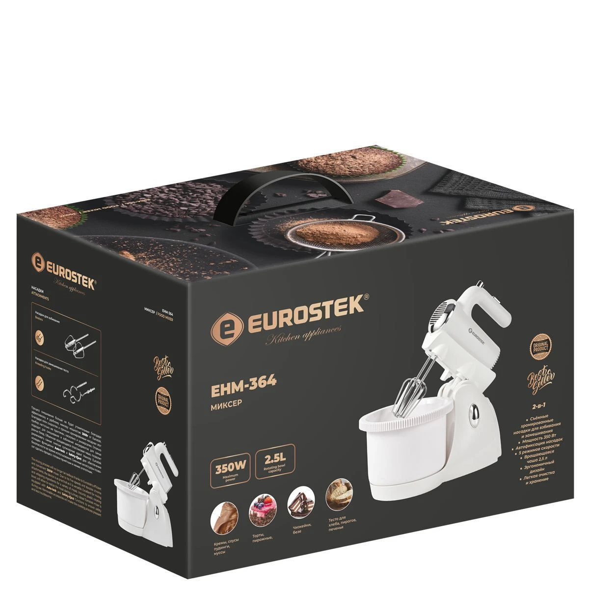 Миксер ручной Eurostek EHM-364. Мощность 350 Вт, 5 скоростей, объем вращающейся пластиковой чаши 2.5 л., насадки для замешивания теста, насадки для взбивания, эргономичный дизайн.