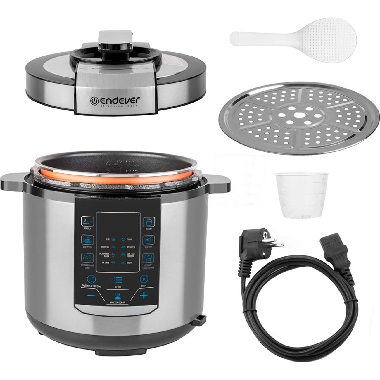 Электрическая мультиварка с функцией скороварки, съемная чаша, контейнер-пароварка, ложка, мерный стакан, шнур питания, руководство по эксплуатации, книга рецептов