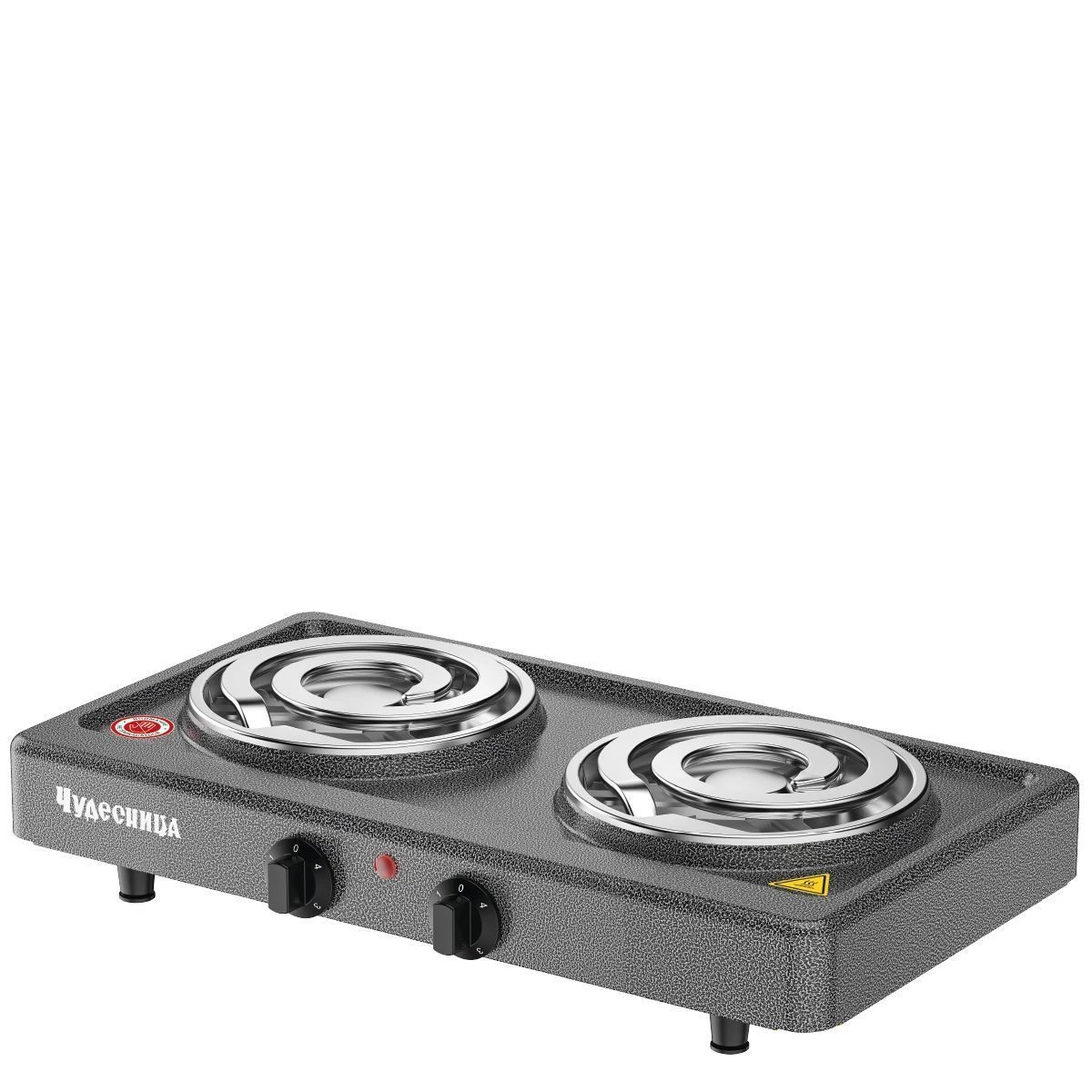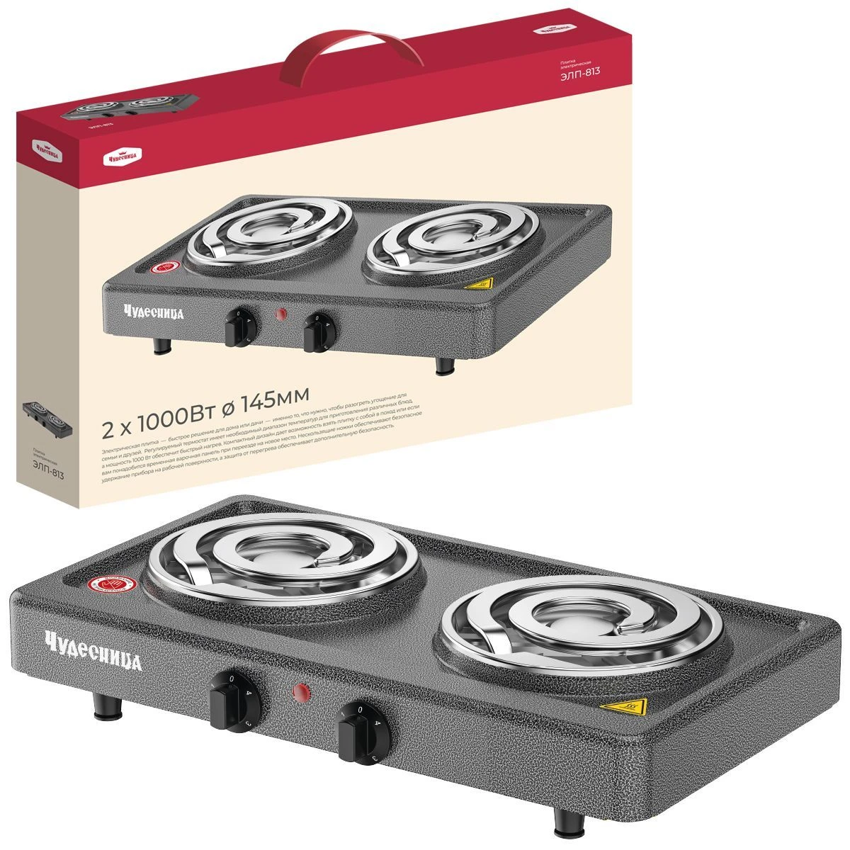 Плитка электрическая Чудесница ЭЛП-813 с 2-мя конфорками, цвет черный, мощность 1000+1000 Вт, толстый спиральный нагревательный элемент из высококачественной стали, плавная регулировка температуры, прочное легкоочищаемое термостойкое эмалевое покрытие, защита от перегрева, световой индикатор работы