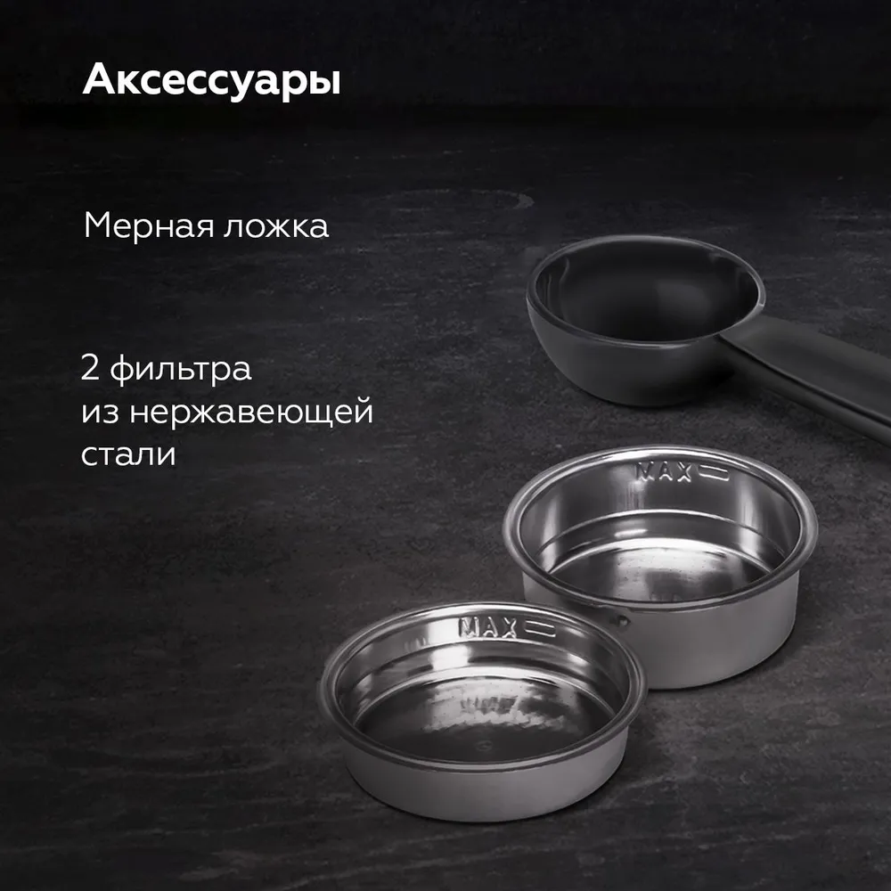 В комплектацию устройства входит 2 фильтра из нержавеющей стали (на 1 и 2 чашки кофе) и мерная ложка.